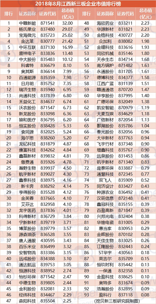 附:2018年8月江西新三板企業(yè)市值排行榜