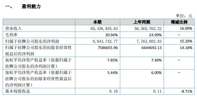公司報告期內(nèi),實現(xiàn)營業(yè)收入 6,543.69 萬元,較上年同期 5,636.58 萬元增加 907.11 萬元,增幅 16.09%;歸屬于掛牌公司股東的凈利潤 894.37 萬元,較上年同期 776.38 萬元增加 117.99 萬元,增幅 15.20%。