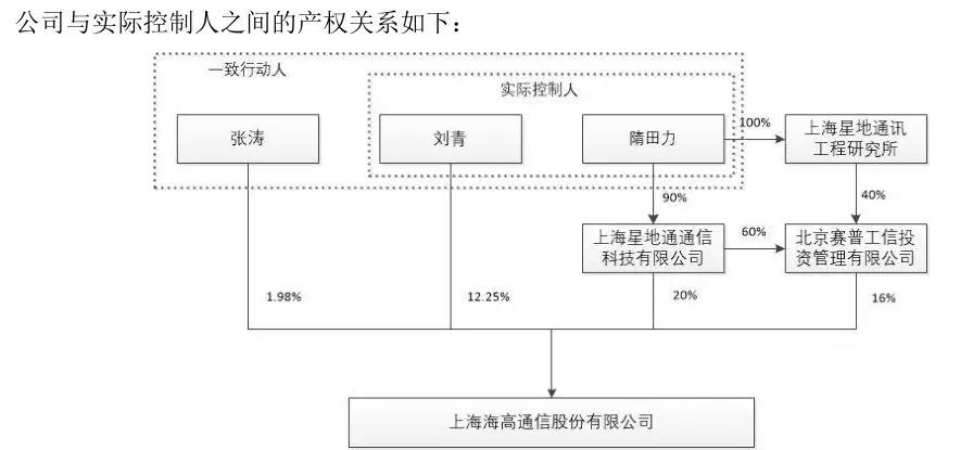 由于股權較分散,海高通信目前沒有控股股東,第一大股東上海星地通通信有限公司持有海高通信20%的股份,實控人為隋田力和劉青,劉青是隋田力小舅子的老婆。同時,劉青的配偶張濤與上述二人為一致行動人。