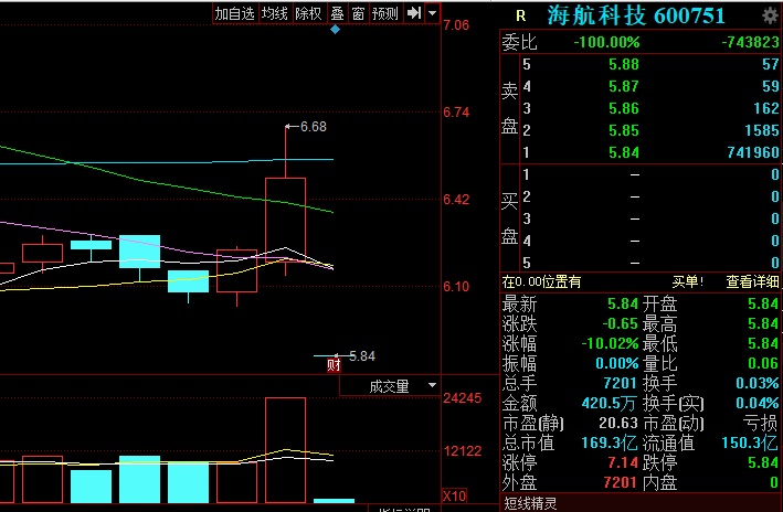 挖貝網(wǎng) 9月25日消息,今日,停牌超8個(gè)月的A股上市公司海航科技(600751)復(fù)牌,開盤即跌停。截至收盤,海航科技股價(jià)報(bào)收于5.84元,跌幅為10.02%,封單超74萬手。