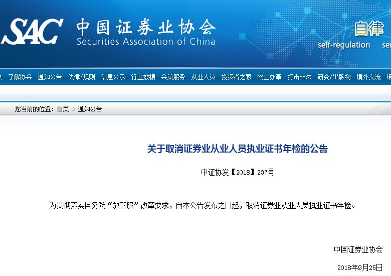 中國證券業(yè)協(xié)會稱,為貫徹落實國務院“放管服”改革要求,自本公告發(fā)布之日起,取消證券業(yè)從業(yè)人員執(zhí)業(yè)證書年檢。