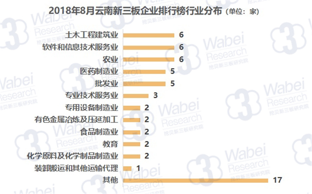 從行業(yè)分布來看,土木工程建筑業(yè)、軟件和信息技術(shù)服務(wù)業(yè)、農(nóng)業(yè)的企業(yè)數(shù)量最多,均有6家企業(yè);其次是醫(yī)藥制造業(yè)、批發(fā)業(yè),均有5家企業(yè)。(來源:挖貝新三板研究院)