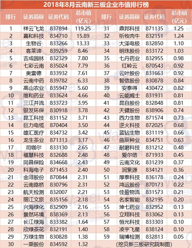 附:2018年8月云南新三板企業(yè)市值排行榜