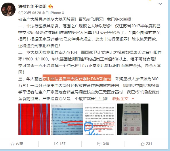 近期,華大基因各類負(fù)面?zhèn)涫苌鐣?huì)關(guān)注。前幾日,王德明發(fā)微博稱,華大基因使用非法劣質(zhì)三無(wú)醫(yī)療器材DNA采血卡,已向江蘇衛(wèi)計(jì)委舉報(bào)其非法行醫(yī),引發(fā)刷屏關(guān)注。