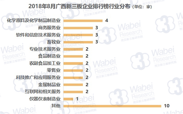 從行業(yè)分布來看,化學原料及化學制品制造業(yè)的企業(yè)數量最多,有4家企業(yè);其次是商務服務業(yè)、軟件和信息技術服務業(yè)、畜牧業(yè),均有3家企業(yè)。(來源:挖貝新三板研究院)