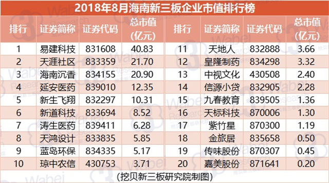 附:2018年8月海南新三板企業(yè)市值排行榜