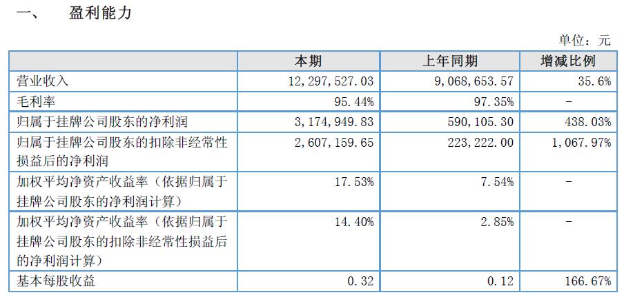 報告期末,公司總資產(chǎn)為2238.85 萬元,較上年同期(2017.6.30)增加1064.01 萬元;營業(yè)收入達(dá)到1229.75 萬元,較上年同期增長322.89 萬元;凈利潤317.49 萬元,較上年同期增加258.48 萬元;經(jīng)營活動產(chǎn)生的現(xiàn)金流量凈額為-133.58 萬元,較上年同期增加 -120.26 萬元。