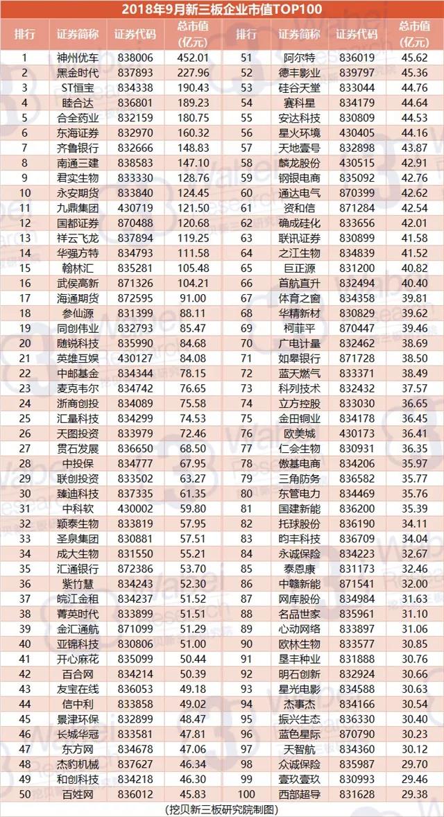 附:2018年9月全國新三板企業(yè)市值TOP100