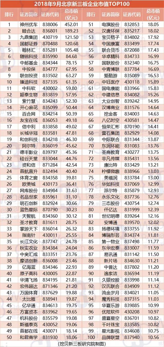 附:2018年9月北京新三板企業(yè)市值TOP100