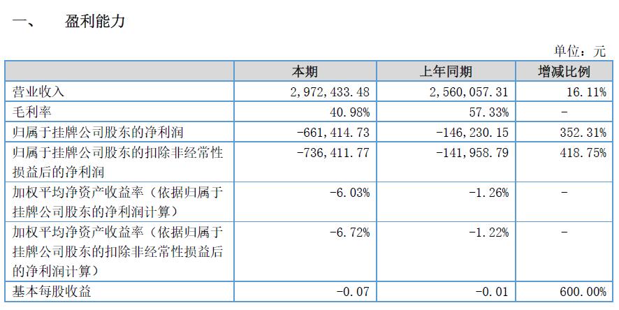 1、報告期內,公司實現(xiàn)銷售收入297.24 萬元,比上年同期相比提高16.11%;資產總計1,218.93萬元,凈資產1,063.24 萬元,與上年同期相比略有下降;凈利潤-66.14 萬元,虧損較上年增加352.31%。與去年同期相比公司虧損增加主要是由于新開發(fā)的集成業(yè)務毛利率較低,使得營業(yè)成本增加;同時,公司加大研發(fā)投入,研發(fā)費用增加;最后,公司為符合公司的業(yè)務發(fā)展更換主辦券商,使得公司的審計咨詢費、證券顧問費大幅增加所致。