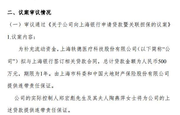 軼德醫(yī)療稱,為補(bǔ)充流動(dòng)資金,軼德醫(yī)療擬與上海銀行簽訂相關(guān)貸款合同,總計(jì)貸款金額為人民幣500萬元,期限為1年。由上海市科委和中國大地財(cái)產(chǎn)保險(xiǎn)股份有限公司提供連帶責(zé)任保證。