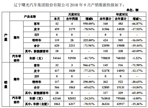 挖貝網(wǎng)訊 10月9日消息,曙光股份(600303)公布了9月產(chǎn)銷數(shù)據(jù)快報,9月份,整車產(chǎn)量同比下滑了71.96%,整車銷量同比下滑了69.62%。值得注意的是,9月,曙光股份的重點車型皮卡車產(chǎn)量、銷量均同比下滑,幅度超70%。