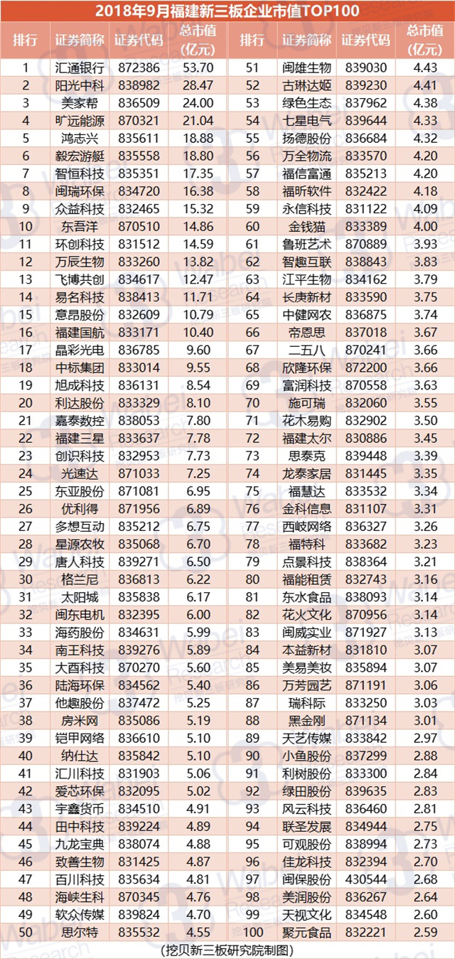 附:2018年9月福建新三板企業(yè)市值TOP100
