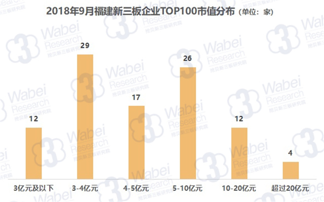 TOP100上榜門(mén)檻為2.59億元,其中有4家企業(yè)市值超過(guò)20億元,而市值在3億元及以下、3-4億元、4-5億元、5-10億元、10-20億元的企業(yè)分別有12家、29家、17家、26家、12家。