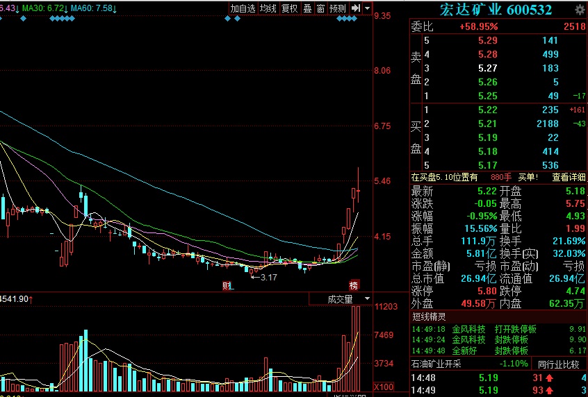 9月27日至10月9日,宏達(dá)礦業(yè)在4個交易日中連收漲停,并且成交量明顯放大。宏達(dá)礦業(yè)近日股價(jià)變動屬異常波動,公司表示,不存在任何應(yīng)披露而未披露的影響股價(jià)的重大信息,如資產(chǎn)重組、發(fā)行股份、資產(chǎn)注入等。今日,宏達(dá)礦業(yè)股票沖高后回落,截至發(fā)稿,股價(jià)為5.22元,成交量已與昨日全天成交量持平。