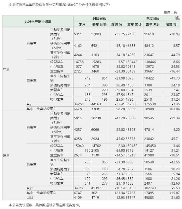 江淮汽車9月產(chǎn)銷快報明細(挖貝網(wǎng)wabei.cn配圖)