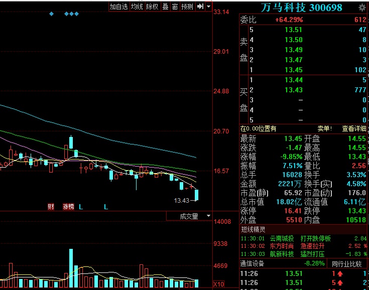 萬馬科技于2017年8月上市,上市后股價快速沖高,最高價為50.5元/股,隨后便震蕩向下。近日,萬馬科技股價跌至自去年10月以來的最低點。截至上午收盤,萬馬科技股價為13.45元/股,下跌9.85%,盤中股價觸及跌停。上午,萬馬科技共成交了1.6萬股,超昨全天成交量。