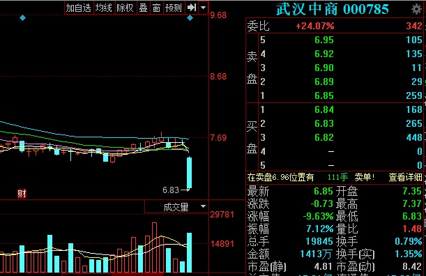今日,大盤(pán)整體走勢(shì)不佳,深證成指下跌6.07%。武漢中商股票跳空低開(kāi)后震蕩向下,近乎跌停,最終,報(bào)收于6.85元/股,大跌9.63%。