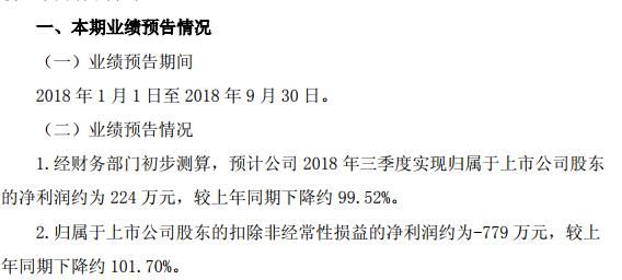 平高電氣稱,經(jīng)財(cái)務(wù)部門初步測算,預(yù)計(jì)公司 2018 年三季度實(shí)現(xiàn)歸屬于上市公司股東 的凈利潤約為 224 萬元,較上年同期下降約 99.52%;歸屬于上市公司股東的扣除非經(jīng)常性損益的虧損779 萬元,較上年同期下降約 101.70%。