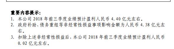 ST 油服表示,2018 年前三季度,公司非經(jīng)常性損益預(yù)計(jì)增加歸屬于上市公司股東的凈利潤(rùn)為人民幣 4.38 億元左右,其中包括職工分流安置政府財(cái)政補(bǔ)助資金人民幣3.5億元。