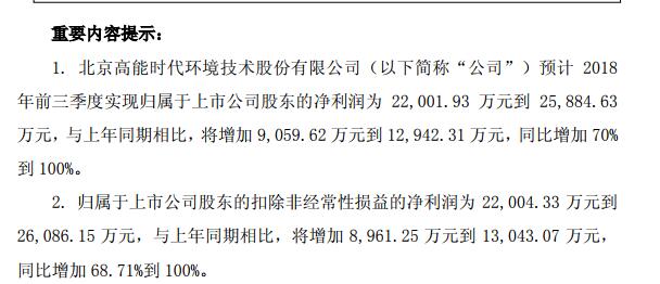 高能環(huán)境稱,經(jīng)公司財務(wù)部門初步測算,預(yù)計 2018 年前三季度利潤在2.2億元-2.59億元之間,與上年同期相比,將增加 9,059.62 萬元到1.29億元,同比增加 70%到 100%。
