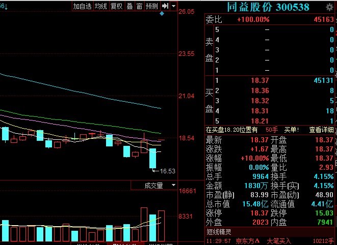 昨日,滬深大盤齊跌超5%,創(chuàng)下兩年半以來(lái)最大跌幅。今日午時(shí)收盤,上證指數(shù)下跌0.12%,深證成指下跌0.32%,同益股份逆勢(shì)漲停。截至午時(shí)收盤,同益股份報(bào)收于18.37元/股,暫收一字板漲停,封單4.5萬(wàn)手。