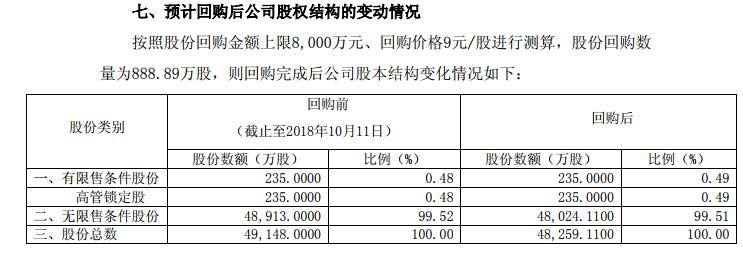 據(jù)介紹,本次回購金額不低于3000萬元且不超過8000萬元。按照不超過9元/股計算,回購的股票數(shù)量在333.33萬股和888.89萬股之間,占公司總股份0.6782%至1.8086%。回購方案自股東大會審議通過回購股份方案之日起6個月內(nèi)執(zhí)行完畢。