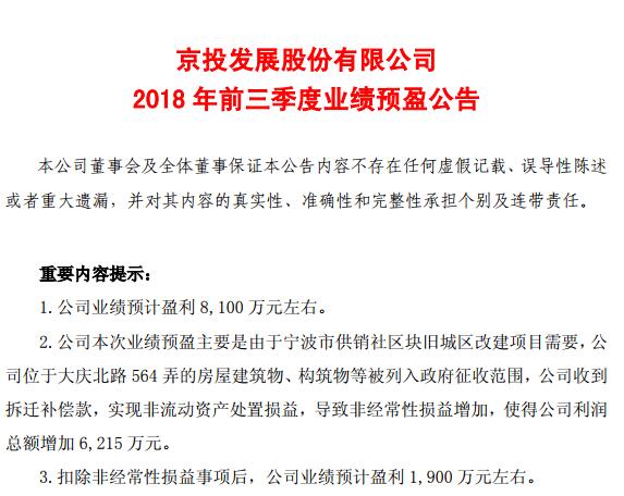 京投發(fā)展稱,根據(jù)估算,公司1-9月盈利8100萬元左右。業(yè)績預(yù)盈主要是由于寧波市供銷社區(qū)塊舊城區(qū)改建項(xiàng)目需要,公司位于大慶北路564弄的房屋建筑物、構(gòu)筑物等被列入政府征收范圍,公司收到拆遷補(bǔ)償款,實(shí)現(xiàn)非流動資產(chǎn)處置損益,導(dǎo)致非經(jīng)常性損益增加,使得公司利潤總額增加6215萬元。
