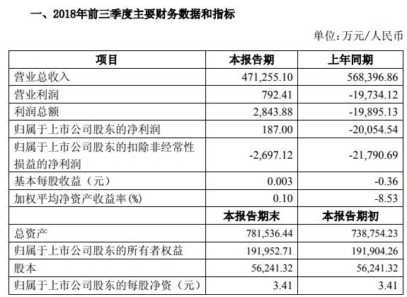 2018年1-9月,公司實(shí)現(xiàn)營(yíng)業(yè)收入47.12億元,與去年同期相比下降17.09%;利潤(rùn)總額2844萬元,同比減少虧損約22,739萬元。