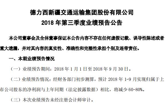 德新交運(yùn)稱,經(jīng)財(cái)務(wù)部門初步測算,預(yù)計(jì) 2018 年 1-9 月實(shí)現(xiàn)歸屬于上市公司股東的凈利潤與上年同期相比,將減少60-80%。