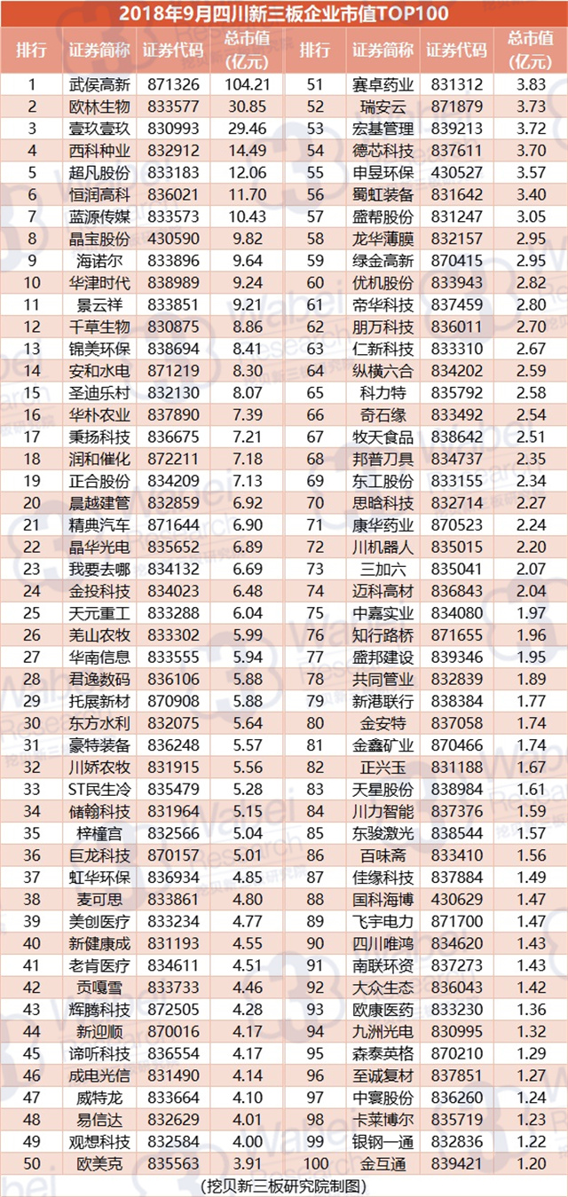 附:2018年9月四川新三板企業(yè)市值TOP100