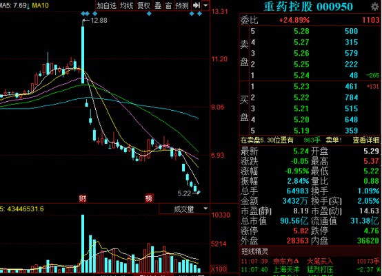 復(fù)牌后,重藥控股股價(jià)一路下行,伴隨著成交量的放大。復(fù)牌前,重藥控股股價(jià)為10.72元/股,昨日收盤,股價(jià)為5.29元/股,已下跌了50.7%。今日,重藥控股平開沖高后開始走低,截至發(fā)稿,股價(jià)為5.24元/股,跌0.95%。