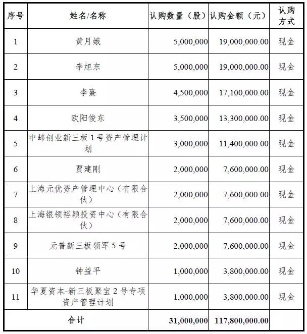 認(rèn)購(gòu)最多的自然人黃月娥和李旭東,分別認(rèn)購(gòu)了500萬(wàn)股,耗資1900萬(wàn)元,認(rèn)購(gòu)最多的機(jī)構(gòu)投資者中郵創(chuàng)業(yè)新三板1號(hào)資產(chǎn)管理計(jì)劃認(rèn)購(gòu)了300萬(wàn)股,耗資1140萬(wàn)元。