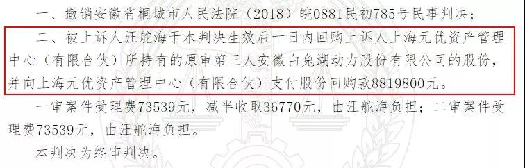 終審判決撤銷(xiāo)一審判決,汪舵海需于判決生效后十日內(nèi),回購(gòu)上海元優(yōu)持有的白兔湖股份,并向上海元優(yōu)支付股份回購(gòu)款881.98萬(wàn)元。