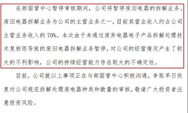 金科環(huán)保稱,在部固管中心暫停審核期間,公司將暫停廢舊電器拆解業(yè)務(wù),對公司的經(jīng)營情況產(chǎn)生了較大的不利影響,公司的持續(xù)經(jīng)營能力存在較大的不確定性。