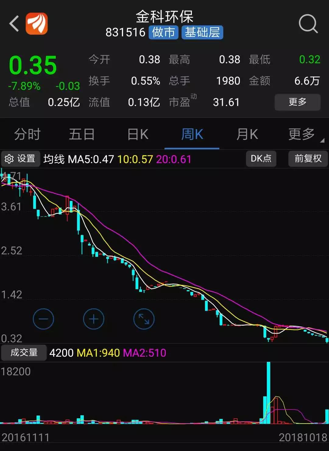 自2016年以來,金科環(huán)保股價一直持續(xù)走低。2016年12月30日,金科環(huán)保收盤價為4.23元/股,至今跌幅超過90%。10月18日金科環(huán)保收盤價為0.35元/股,跌幅為7.89%,成交6.63萬元。