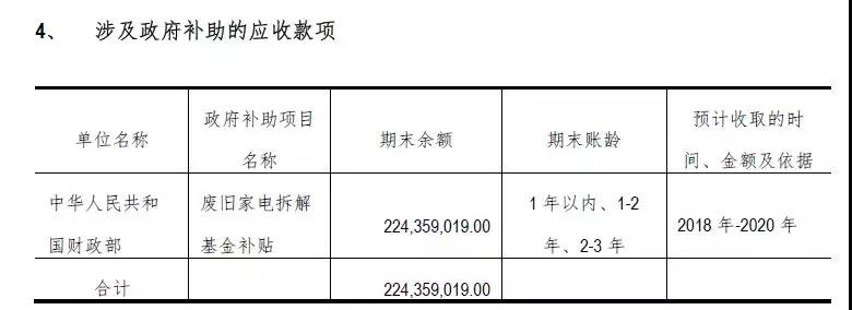 而2018年半年報顯示,報告期末,公司應(yīng)收廢舊家電拆解基金補貼高達2.24億元,賬齡最長為2-3年。公司預(yù)計將在2018年-2020年收回這些基金補貼款。