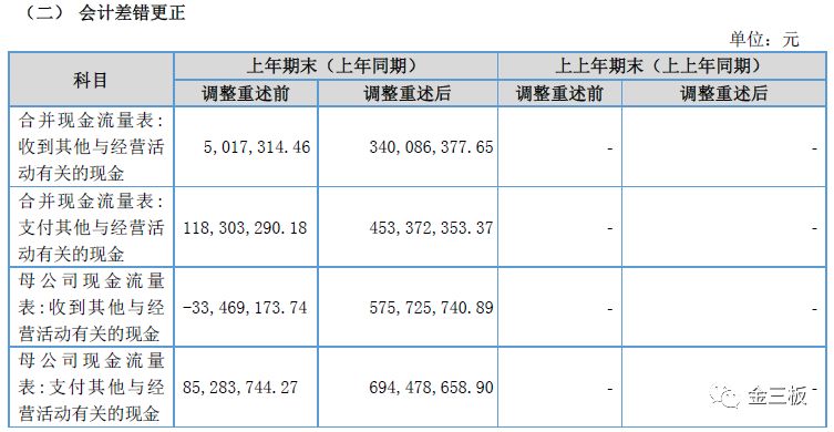 而對(duì)于更正原因,只說(shuō)了一句,“上年度未按貨幣資金發(fā)生額編制,而采用貨幣資金凈額編制。”