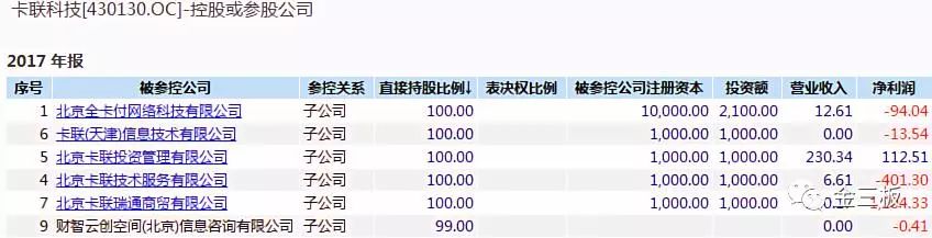 事實(shí)上,除了這三筆投資,卡聯(lián)科技還在2014年底,投資設(shè)立了多家全資子公司,而這些子公司如今的經(jīng)營(yíng)情況,幾乎全線虧損。