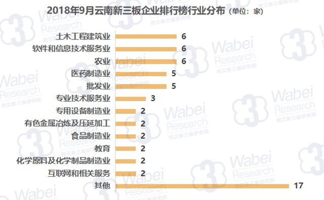 從行業(yè)分布來(lái)看,土木工程建筑業(yè)、軟件和信息技術(shù)服務(wù)業(yè)、農(nóng)業(yè)三個(gè)行業(yè)的上榜企業(yè)數(shù)量最多,均有6家企業(yè);其次是醫(yī)藥制造業(yè)、批發(fā)業(yè),均有5家企業(yè)。(來(lái)源:挖貝新三板研究院)