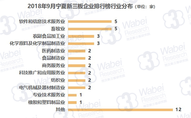 從行業(yè)分布來看,軟件和信息技術服務業(yè)、畜牧業(yè)上榜企業(yè)數(shù)量最多,均有5家企業(yè);其次是農副食品加工業(yè)、化學原料及化學制品制造業(yè),均有3家企業(yè)。(來源:挖貝新三板研究院)