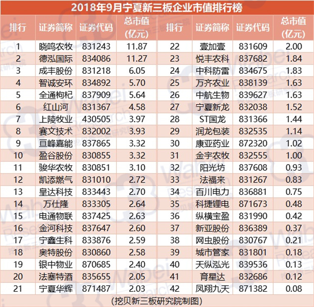 附:2018年9月寧夏新三板企業(yè)市值排行榜