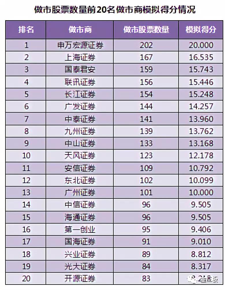 截至目前,做市股票數(shù)量最多的券商,為申萬宏源證券,為202支股票提供做市報價。而數(shù)量最少的,民族證券、中天證券和長城國瑞證券,各自只有1支做市股票。