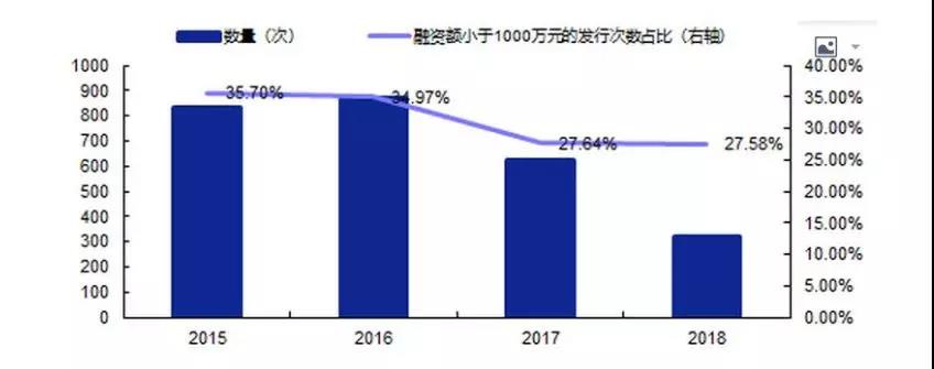 據(jù)安信證券統(tǒng)計,2015年至今,新三板公司單次定增融資金額小于1000萬元的發(fā)行次數(shù)占比達(dá)到20%-30%左右,體現(xiàn)了掛牌中小企業(yè)“小額快速”的融資特點。
