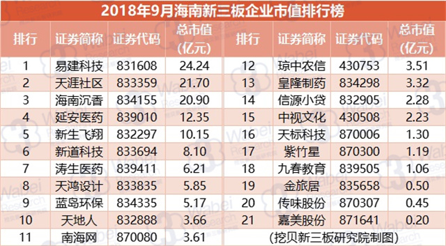 附:2018年9月海南新三板企業(yè)市值排行榜
