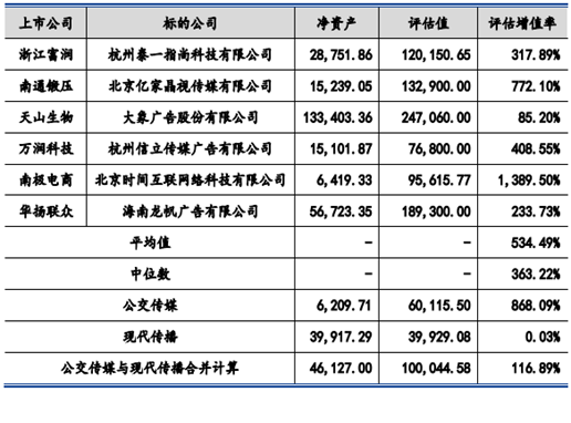 考慮到估值,截至評估基準日 2018 年 3 月 31 日,公交傳媒的凈資產(chǎn)為 6,209.71 萬元,評估值為 60,115.50 萬元,評估增值 53,905.79 萬元,評估增值率為 868.09%;現(xiàn)代傳播的凈資產(chǎn)為 39,917.29 萬元,評估值為 39,929.08 萬元,評估增值 11.79 萬元,評估增值率為 0.03%。