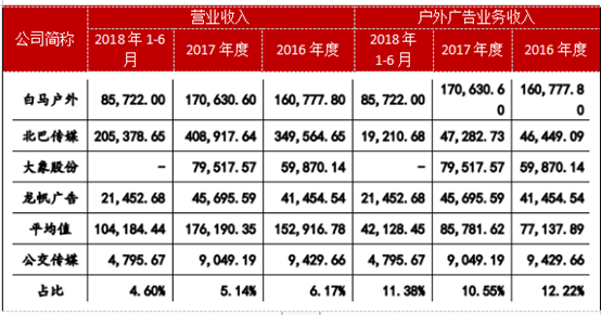 從收入規(guī)模來看,公交傳媒也與行業(yè)平均水平相去甚遠,營業(yè)收入方面,公交傳媒僅占行業(yè)均值比例為4.60%,而戶外廣告收入方面,公交傳媒僅占行業(yè)均值比例為11.38%,具體情況如下:
