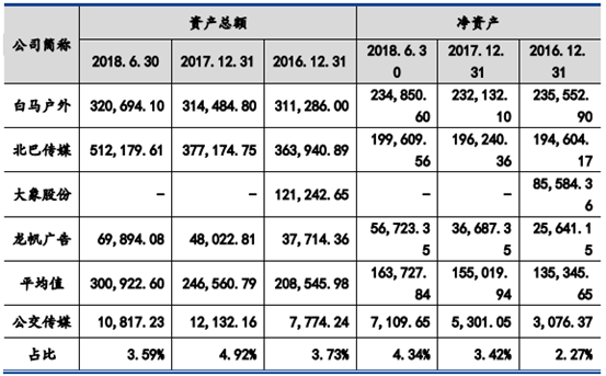并購報告書披露了公交傳媒和可比公司的對比情況,從資產(chǎn)規(guī)模來看,公交傳媒占行業(yè)均值比例僅為3.59%,而從凈資產(chǎn)規(guī)模來看,公交傳媒占行業(yè)均值比例則僅為4.34%,具體如下:
