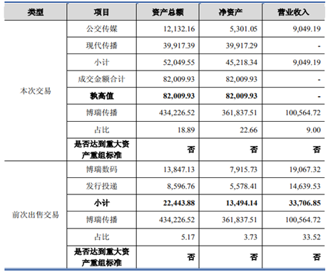 從并購報告書來看,博瑞傳播此次交易擬向成都傳媒集團(以下簡稱成都傳媒)以發(fā)行股份的方式購買其持有的現(xiàn)代傳播 100%股權(quán)及公交傳媒 70%股權(quán)。現(xiàn)代傳播 100%股權(quán)作價為 39,929.08 萬元,公交傳媒 70%股權(quán)作價為 42,080.85 萬元,這意味著此次交易價格合計 82,009.93 萬元。需要注意的是,成都傳媒是博瑞傳播的控股股東,持有上市公司32.40%股份,實際控制人為成都國資委,而現(xiàn)代傳播和公交傳媒分別是成都傳媒全資子公司和持股70%的企業(yè),因此此次交易構(gòu)成關(guān)聯(lián)交易。