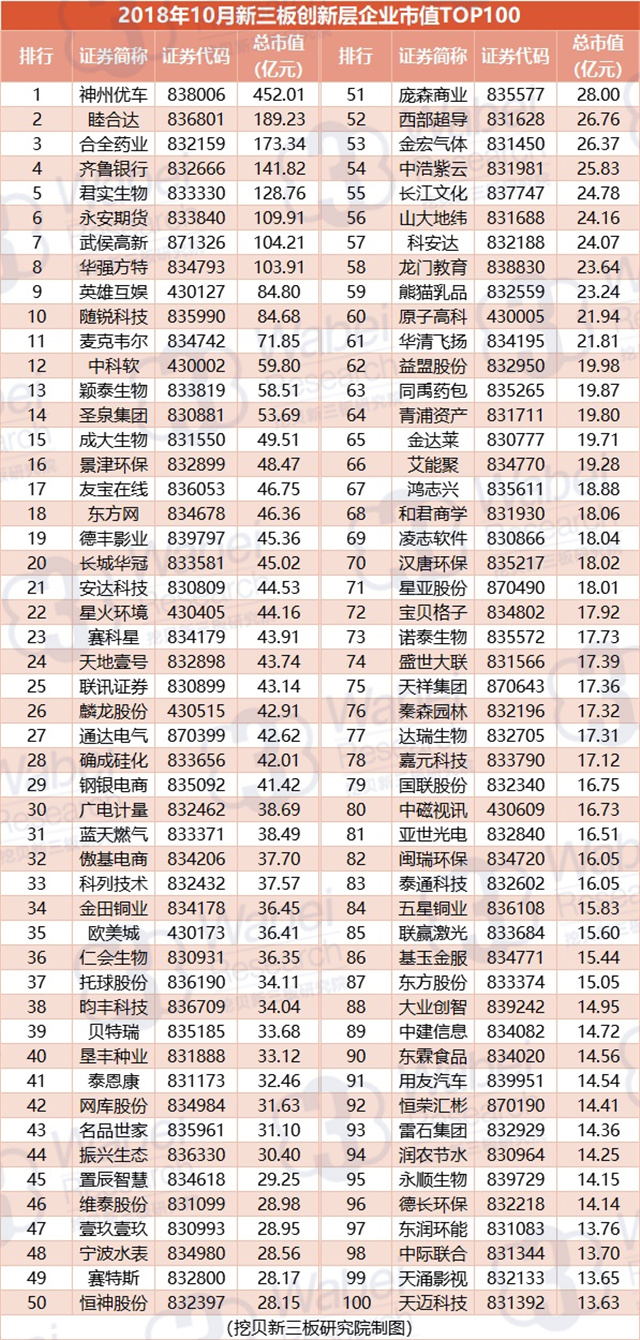 附:2018年10月全國新三板創(chuàng)新層企業(yè)市值TOP100